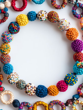 A vibrant arrangement of handmade accessories is displayed in a circular pattern. Each piece features unique colors and textures, highlighting creativity and craftsmanship.