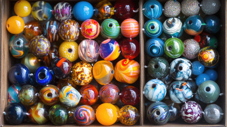 Array of colorful decorative glass beads. Artistic glasswork with various patterns and hues. Concept of handmade accessories, decorative crafts, and the beauty of glassmaking.