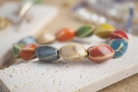 Close-up of female designer making handmade jewelry from colorful beads at the table