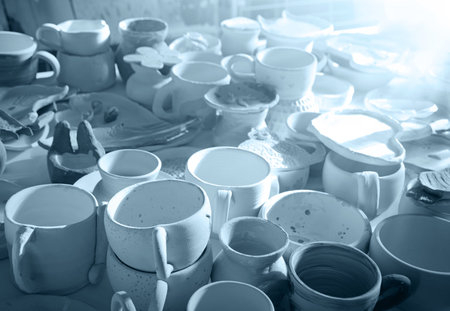 Pottery workshop products on table close up. Handmade, creativity and hobby concept.