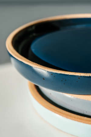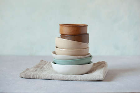 Ceramic bowls on the table, close-up, selective focus
