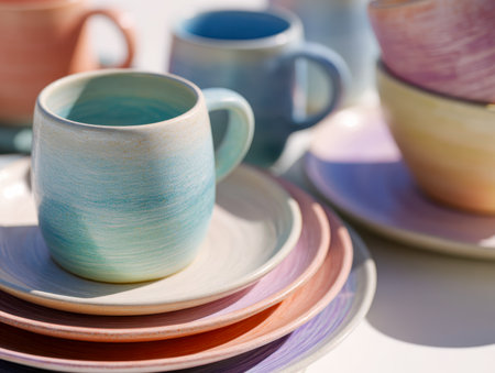 Elegant handmade ceramics showcase gentle pastel hues, artfully stacked to evoke warmth and charm, perfect for intimate meals and relaxed gatherings.