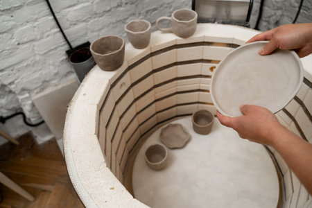 Clay mugs into kiln for firing pottery in workshop