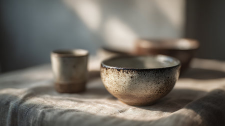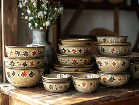 Handcrafted ceramic bowls with intricate designs create a rustic and inviting scene