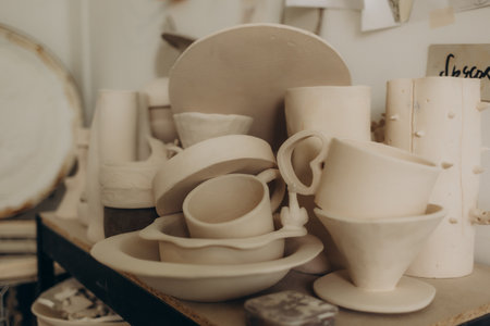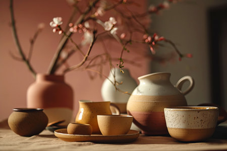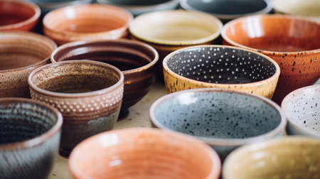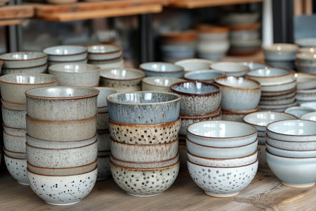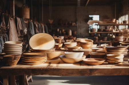 AI Generated. Handmade pottery pieces including bowls plates and mugs showcase