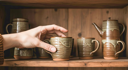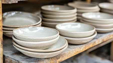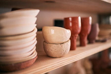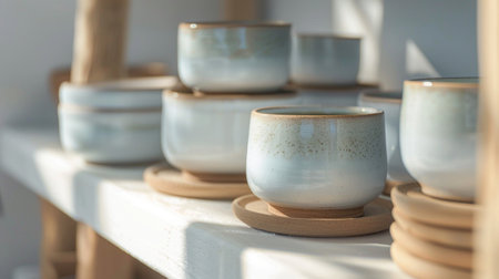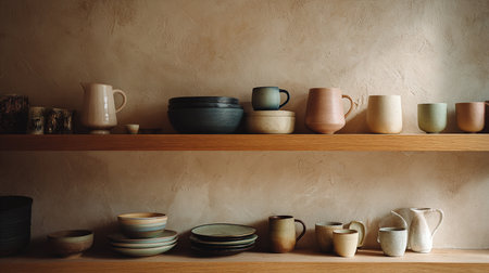 Capture handmade ceramic tableware. Explore studio pottery and contemporary stoneware design displayed on wooden shelf. Uncover handcrafted ceramics, bowls, mugs, plates, cups and artisan design. AI Generative AI generated