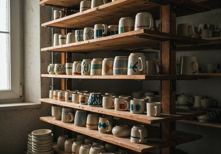 A variety of handcrafted pottery displayed on wooden shelves, creating a rustic and artisanal atmosphere.