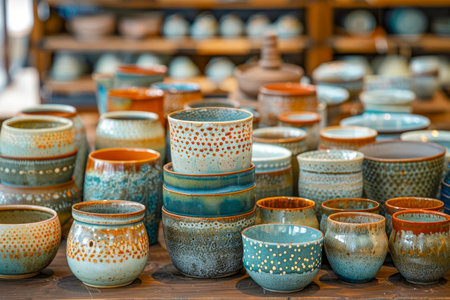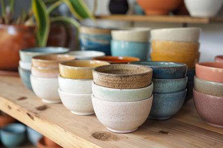 Artisanal Pottery Collection Displayed on Wooden Shelves Featuring Colorful Ceramic Bowls and Handcrafted Vessels in Various Patterns and Sizes AI Generative