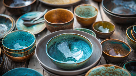 Assorted ceramic bowls and plates with various glazes, arranged on a rustic wooden table, highlighting the craftsmanship and artistic design.