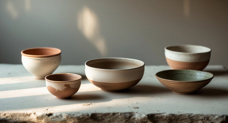 Minimalist ceramic bowls arranged in neat rows on sunlit surface. Tableware concept for modern kitchens, artisanal pottery, stylish dining presentations, kitchen branding and dishware advertising
