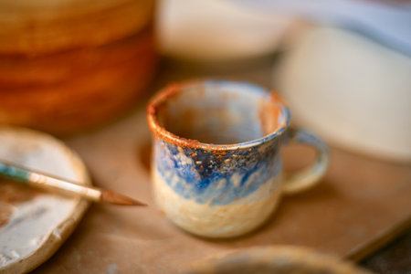 Handmade ceramic dishes on an old vintage table, Sensitive Focus