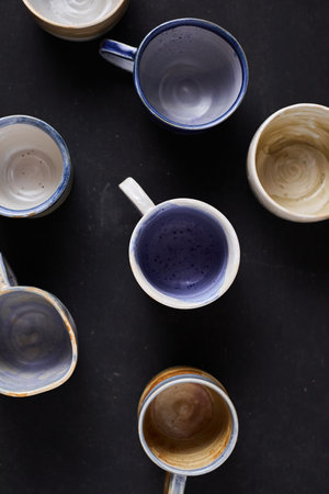 Many colorful ceramic hand made cups, top view. Handmade craft