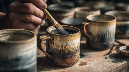 A beautiful assortment of handcrafted ceramic cups and mugs displayed on a rustic table. The colorful designs and intricate textures add charm to any setting.
