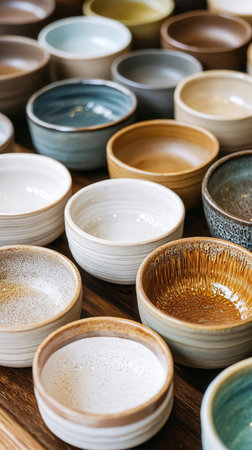 Discover a beautiful assortment of handmade ceramic bowls with various stunning glazes and textures, perfect for home decor or dining settings.