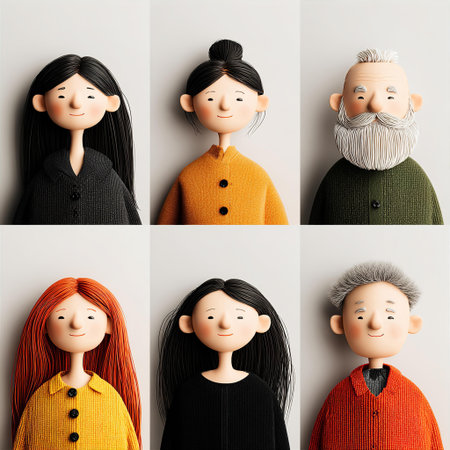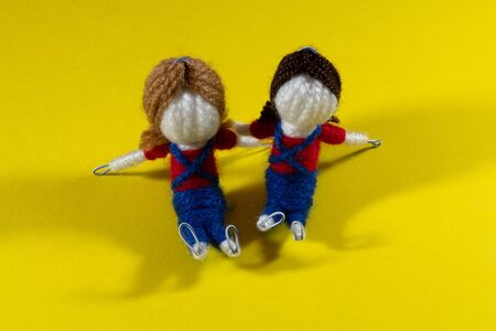 Handcrafted dolls representing diversity and friendship sit hand in hand on a vibrant yellow background. Ideal for creatives seeking playful illustrations and cheerful designs.