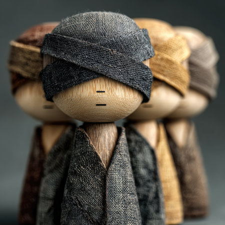 Several wooden figurines are arranged in a row, each exhibiting unique head coverings and garments. The composition is marked by muted tones of gray, brown, and beige. The lighting appears soft, casting subtle shadows across the textured surfaces. This image might be suited for creative projects or editorial content.