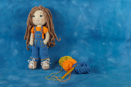 amigurumi doll handmade on a blue background with the yarns used for its elaboration