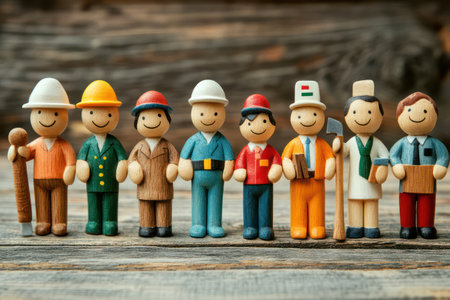 Colorful wooden figurines in uniforms representing different professions, including doctors, workers, and office staff, symbolizing diversity and employment.