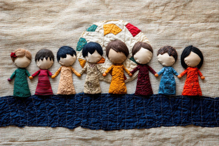 A collection of handmade textile figures, each uniquely designed, holds hands in front of a colorful backdrop. The artwork symbolizes unity and diversity, showcasing craftsmanship.