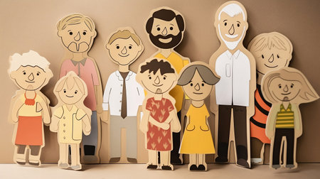 Paperboard Cutouts of Happy Family in Cartoon Style illuminated by a warm light from the side