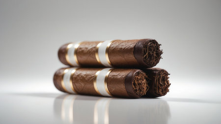 Three premium cigars with golden bands stacked neatly on a reflective surface. The detailed texture of the tobacco and wrapper is highlighted under soft lighting.