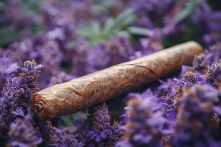 A cigar rests elegantly on a bed of vibrant purple flowers showcasing the contrast between the earthy tones of the cigar and natures beauty.