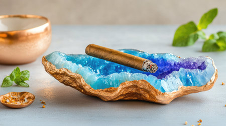 Brown cigar gently placed in a vibrant blue geode ashtray on a dark stone counter, highlighting luxury and contrast