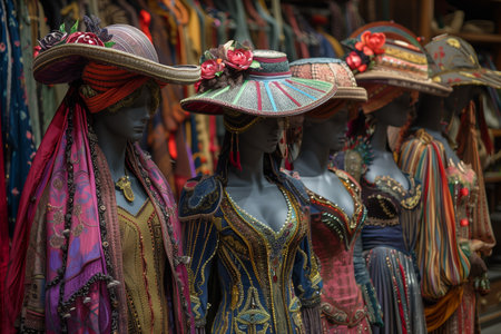 This image showcases a stunning collection of traditional clothing displayed on mannequins, highlighting intricate patterns and rich textures.