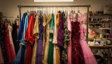 Medium shot capturing hanging racks densely packed with colorful costume fabrics main rack in crisp detail against soft focus room edges.