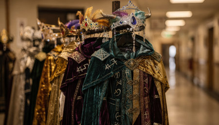 Medium shot of a corridor filled with whimsical fantasy cloaks and headpieces the main rack sharply focused while the rest of the space remains out of focus.