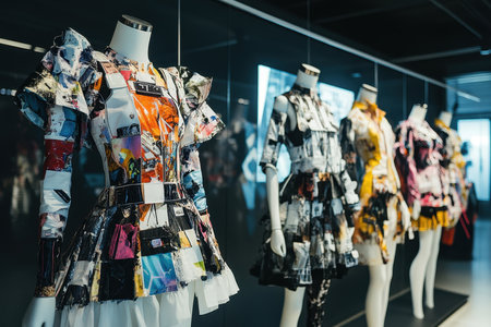 A diverse collection of innovative dresses made from unique materials is showcased in a contemporary gallery. The colorful designs are attractively arranged on elegant mannequins.