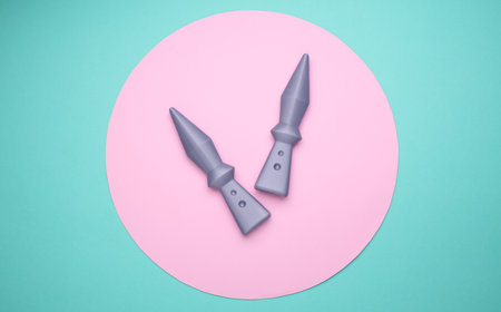 Fantasy dagger with blue light on a yellow background. Close-up.