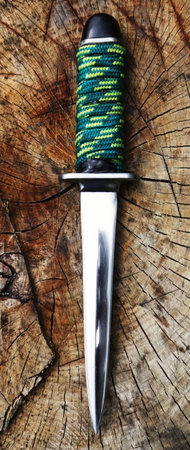 a survival knife sticking out of a wooden stump in a forest setting, created with generative ai
