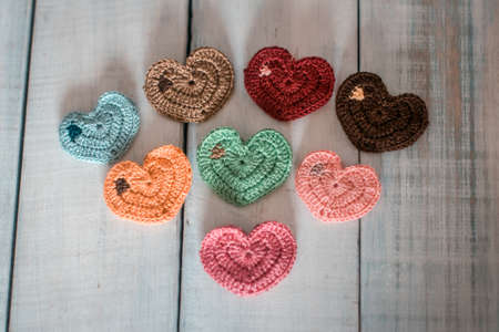 Mobile background with hand-knotted yarn in squares of various colors arranged on the floor of an old wooden table ready to be hung and decorated at one of the festivals in Thailand.