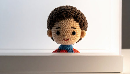 crochet amigurumi doll centered on frosted acrylic with soft back glow clean edges and tidy outline friendly studio object for craft toy and minimalist decor