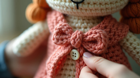 Close-up of handmade crochet doll in pink outfit with button detail.