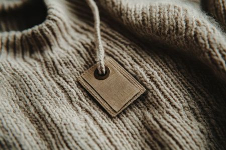 Close-up of soft sustainable knitwear garment featuring eco-friendly recycled materials tag, emphasizing ethical fashion and responsible modern clothing.