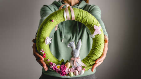 Close up on homemade yarn Crocheted Easter wreath DIY wool decoration hobby craft in hands of unknown caucasian woman giving it as present - hobby and holiday celebration concept