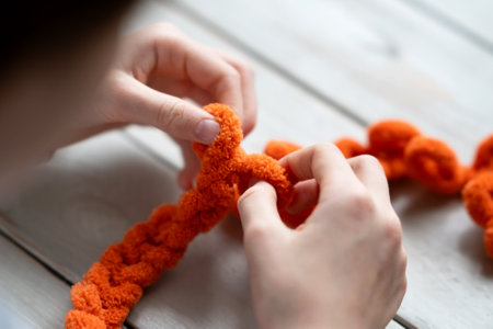 Woman working out last details of an almost-finished macrame piece, combing ropes inside a home room. Close up. Natural cotton threads and wooden beads. Female hobby. Wall hanging decor.