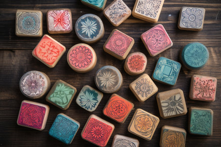 Assorted rubber stamps arranged in a colorful pattern on a rustic wooden background