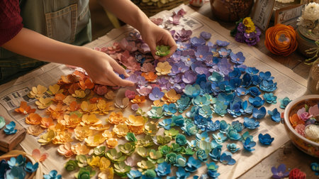 Woman Arranging Colorful Paper Flowers on a Workspace, Creativity, Art and Craft Concept