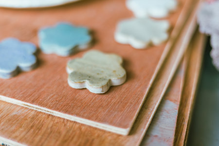 Various shapes in different colors are arranged on a light background, showcasing natural textures and leaf-inspired designs in a creative display.