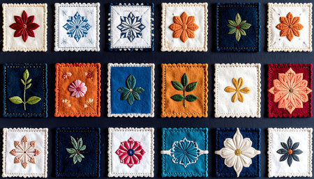 Colorful abstract textile art with embroidered patterns and textures. That the image is generated using AI.