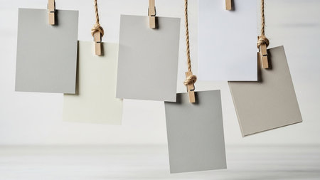 Against showing hanging paper cards with wooden clothespins on twine against a light background. High resolution image suitable for commercial use.