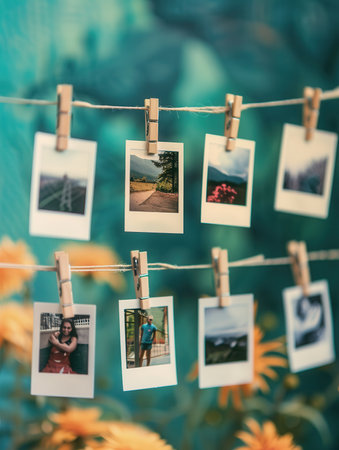 Polaroid photos hang on a string with clothespins, bright against a blue and green backdrop, celebrating memories.