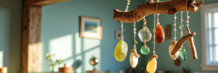 Rustic driftwood mobile with colorful glass ornaments in sunlit room. That the image is generated using AI.