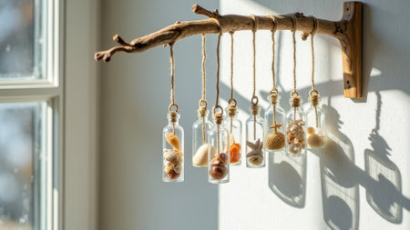 Glass bottles hanging from driftwood displaying seaside treasures with natural sunlight.