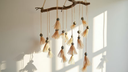Natural branch hanging with tassels and beads casting shadows on a sunny wall. That the image is generated using AI.