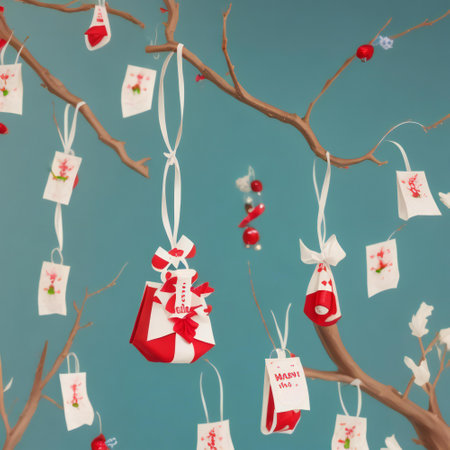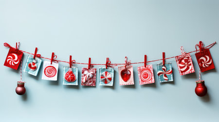 Christmas decorations, holiday cards hanging on a string, festive atmosphere with bokeh lights in the background, vibrant colors of red and green, capturing the essence of the season