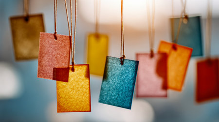 Vibrant, semi-transparent tags suspended gently in the light, casting warm hues and creating a dreamy, artistic backdrop with soft sunlight and blurred tones